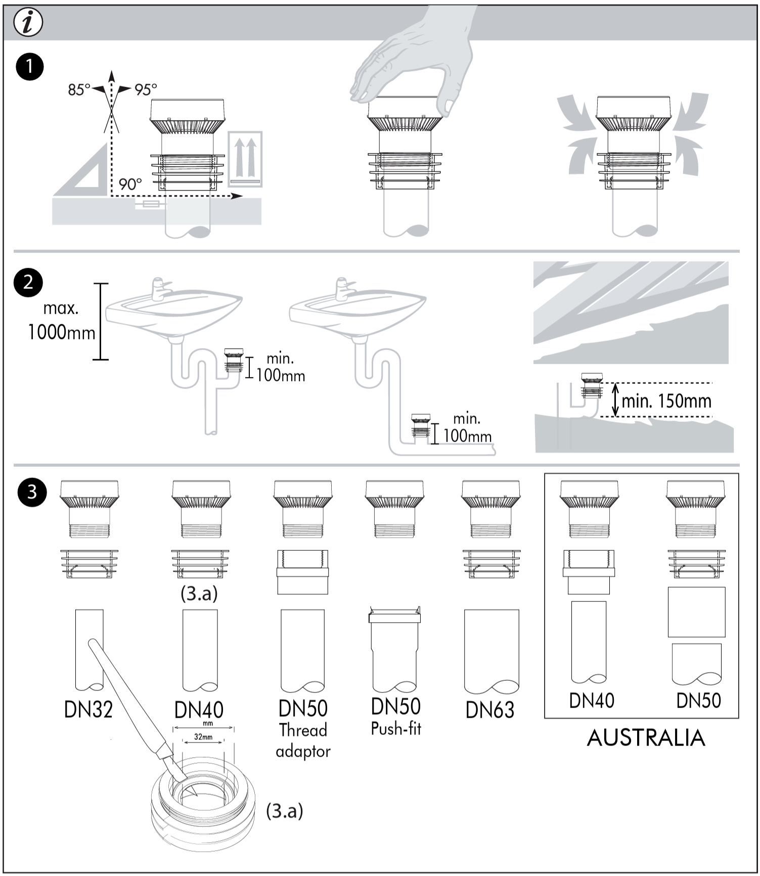 סטיודור מיני-ונט 32 מ"מ, 40 מ"מ, ("2 + 1/2 "1 ) לשימוש בבית – מונע ריח ומווסת לחצים בצנרת ביוב כולל מתאם לקטרים שונים