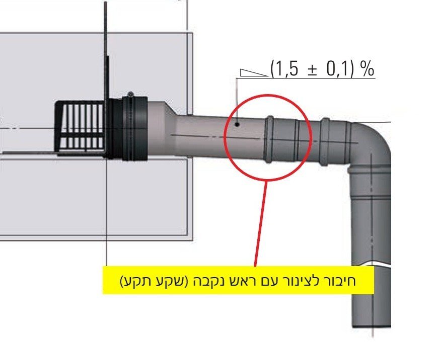 נקז מודולרי כניסה (פתח קליטה) "4 צול עם מוצאים משתנים, ("ניפל" מתחבר עם מעבר מ 110 מ"מ לקטרים 2, 3 או 4 צול (לחיבור שקע תקע צנרת עם ראש נקבה)