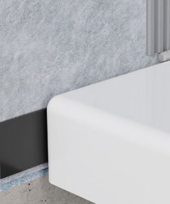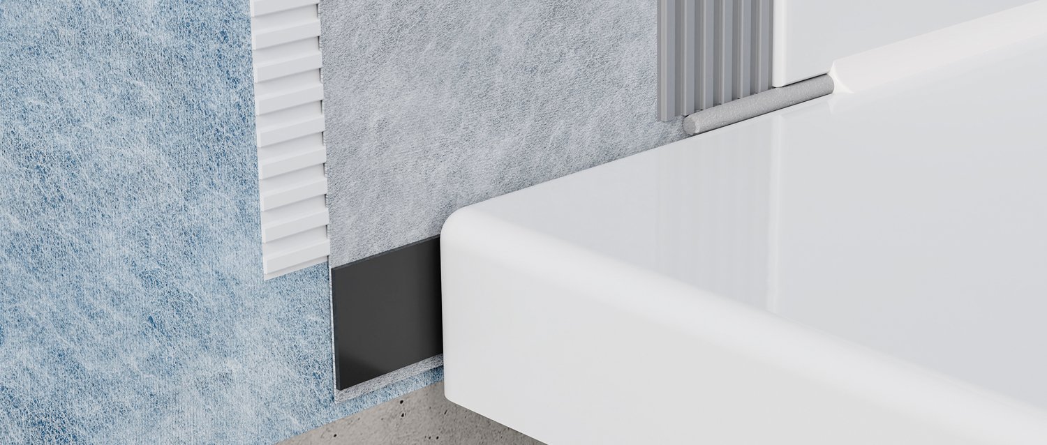 רצועת בד גמיש לא ארוג (PP) אטום עם פס הדבקה בוטילי הנדבק לשולי קנט האמבט, והיתרה להדבקה בין הקיר לבין אריחי החיפוי ( עם דבק אריחים צמנטי)